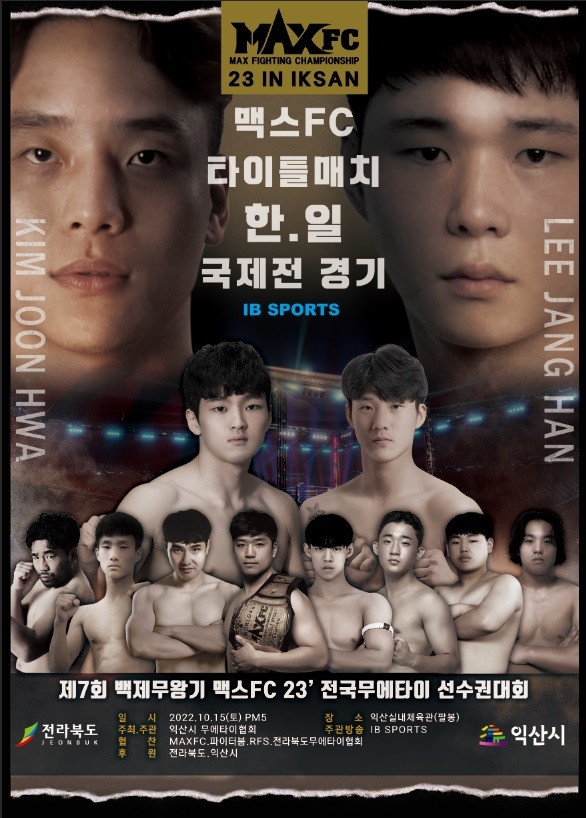 이번 ‘MAX FC 퍼스트리그 22’ 대회는 제7회 백제무왕기 전국 무에타이 선수권대회와 함께, 10월 16일 전북 익산 실내체육관에서 개최되며, 주먹과 발차기만을 허용하는 퍼스트리그 룰로 진행된다. 전 관람석 무료 입장으로 진행되며, 유튜브 채널 MAX FC 에서 생중계된다.