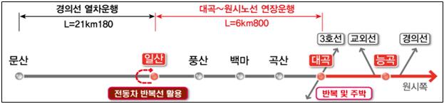 일산역 연장운행 사업은 별도의 선로를 건설할 필요 없이 기존 경의선 구간인 대곡역에서 일산역를 잇는 약 6.8㎞에 대한 시설개량 사업으로, 환승역 4개소(곡산,백마,풍산,일산)를 서해선(대곡∼소사)복선전철 민간투자 시설사업과 연계해 추진하는 사업이다.