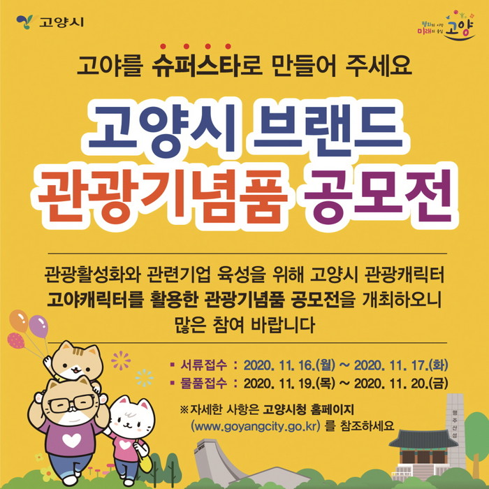 [부자동네타임즈 김인수기자] 고양시는 "관광 활성화와 관련 기업 육성을 위해 ‘고양시 브랜드 관광기념품 공모전’을 개최한다."고 15일 밝혔다.