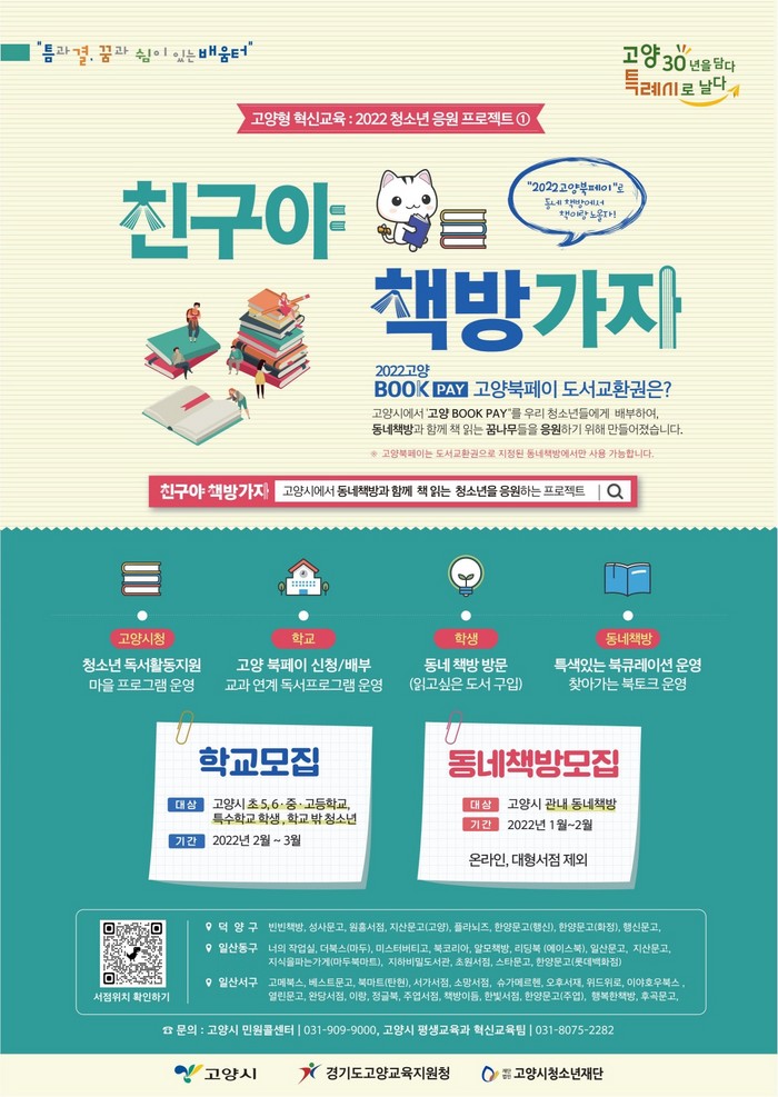 [부자동네타임즈 김인수기자] 고양시가 관내 동네 책방과 연계한 청소년 독서활동 지원을 위해 작년에 이어 ‘친구야~ 책방가자!’사업을 운영하고 참여 학교를 오는 3월 21일(월)까지 모집한다.