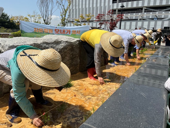 국립암센터 치유정원 모내기 행사는 올해로 3년차를 맞는다. 올해 행사에는 고양시농업기술센터(소장 권지선)와 국립암센터(원장 서홍관) 관계자 4명이 직접 모내기를 진행했다.