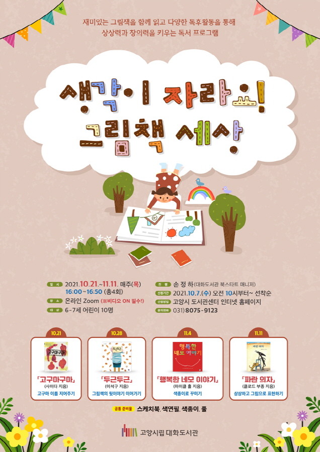 [부자동네타임즈 김인수기자] 고양시 대화도서관이 6-7세 어린이들을 위한 독서프로그램 「생각이 자라요! 그림책 세상」을 10월 21일(목)부터 11월 11일(목)까지 운영한다.