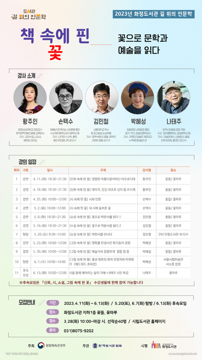 꽃 특성화 화정도서관은 올해 ‘책 속에 핀 꽃 – 꽃으로 문학과 예술을 읽다’를 주제로 신화, 시, 소설, 그림 등 다양한 매체 속에 존재하는 꽃 이야기를 선보일 예정이다.