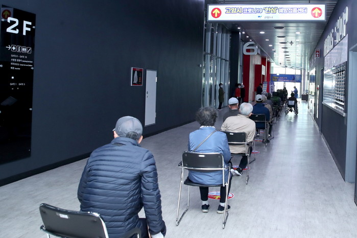 [부자동네타임즈 김인수기자] 28일 개소한 ‘고양시 코로나19 안심 예방접종(일산서구)’에서 2분기 접종 대상자인 75세 이상 어르신들이 대기하고 있다. 오늘 이곳에서는 450명에게 백신접종을 한다. 예방접종센터에는 의사2명·간호사2명·응급구조사1명 등 총 40명의 인력이 배치된다.