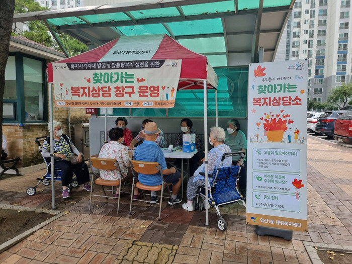 지난 8월 25일 일산1동 맞춤형복지팀장, 지역사회보장협의체 위원이 함께 지역 내 취약계층이 많이 거주하는 26·27통 동양아파트 후문 안쪽 경비실 옆에서 찾아가는 복지상담소를 설치하고 복지사각지대 발굴, 상담 및 맞춤형복지 정보를 제공했다.