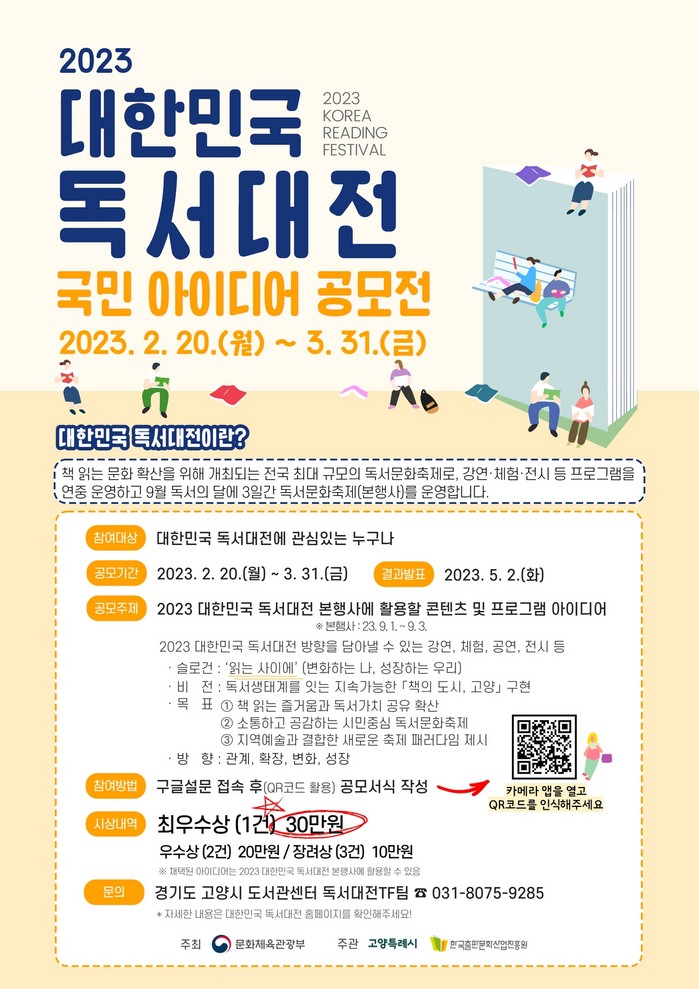 ‘2023 대한민국 독서대전’과 ‘국민 아이디어 공모전’에 대한 자세한 내용은 대한민국 독서대전 홈페이지를 참고하거나 독서대전TF팀(☎031-8075-9285)으로 문의하면 된다.