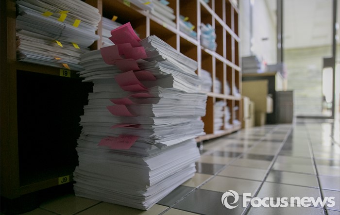 (서울=포커스뉴스) 19대 마지막 정기국회 종료를 하루 앞두고 여야 정쟁에 휘말려 일부 법안들이 처리 무산될 것으로 보이는 8일 오후 서울 여의도 국회 한 상임위원회 앞에 법안 자료들이 쌓여 있다.