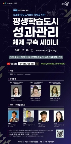 실시간 생중계되는 세미나에서는 국가평생교육진흥원 김만희 실장의 진행으로, 고양시 평생교육과 김호석 팀장, 경상남도평생교육진흥원 고영화 팀장, 순천향대학교 평생교육학부 김현수 교수의 발표와 토론이 이어진다.
