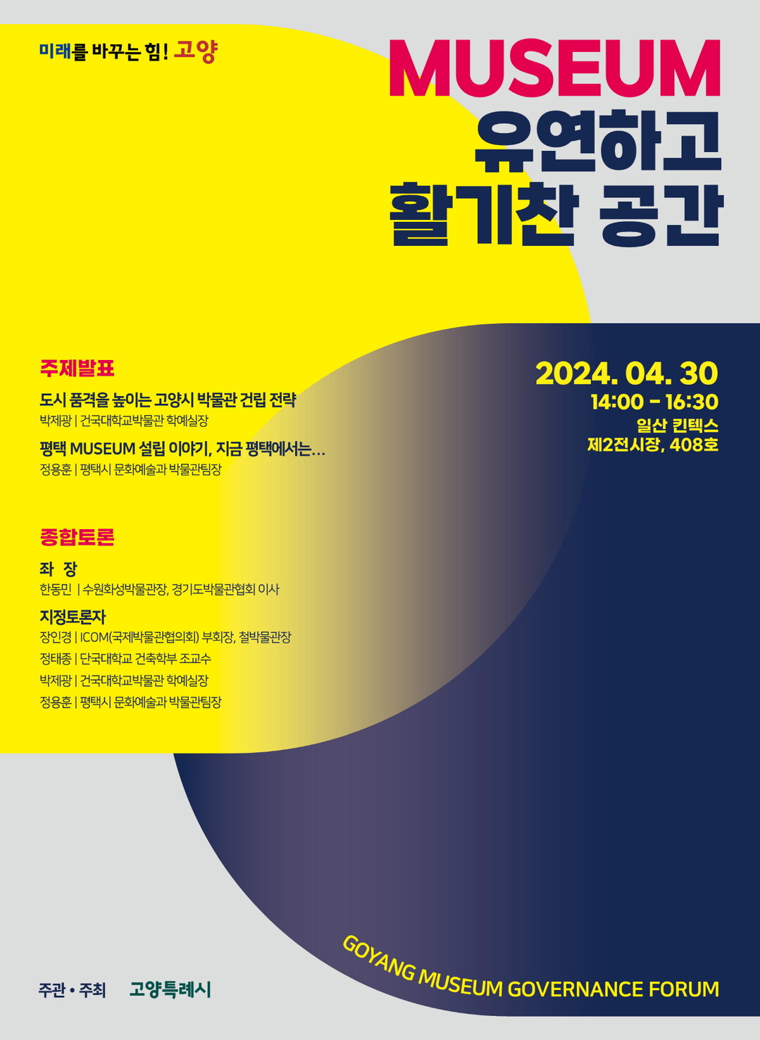 이번 포럼은 ‘MUSEUM, 유연하고 활기찬 공간’을 주제로, 고양시의 공립박물관 건립에 대해 시민들과 함께하는 첫 번째 공개 포럼으로 주제 발표와 다양한 전문가들 토론으로 꾸려진다.