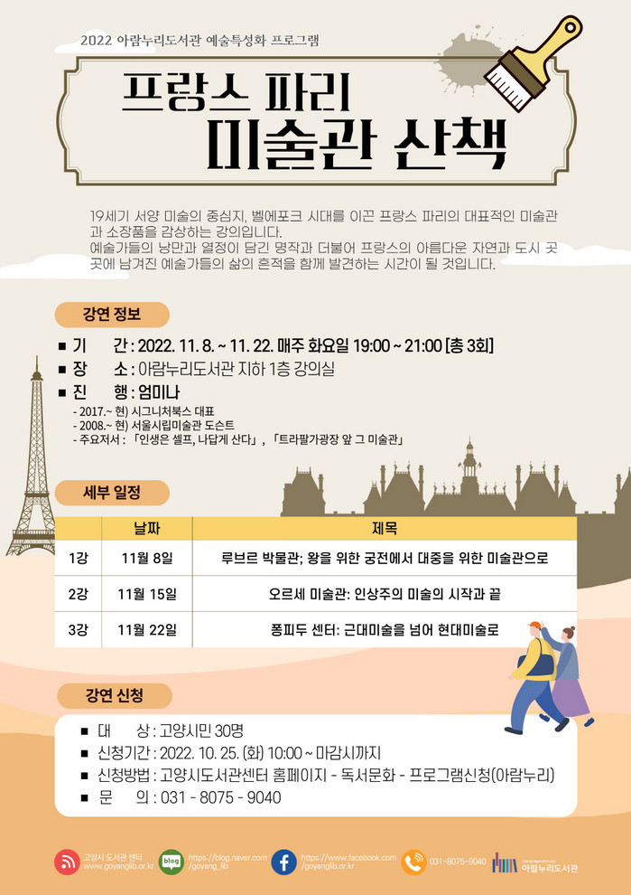 [부자동네타임즈 김인수기자] 고양특례시(시장 이동환) 아람누리도서관은 오는 11월 8일부터 22일까지 매주 화요일 저녁 7시부터 9시까지 3회에 걸쳐 예술특화프로그램 ‘프랑스 파리 미술관 산책 ’을 운영한다.
