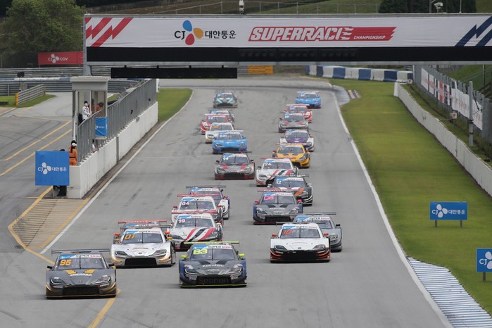 [사진설명] 에버랜드 스피드웨이에서 열린 2020 CJ대한통운 슈퍼레이스 챔피언십 3라운드 슈퍼 6000 클래스 결승에서 머신들이 스타트하고 있다.