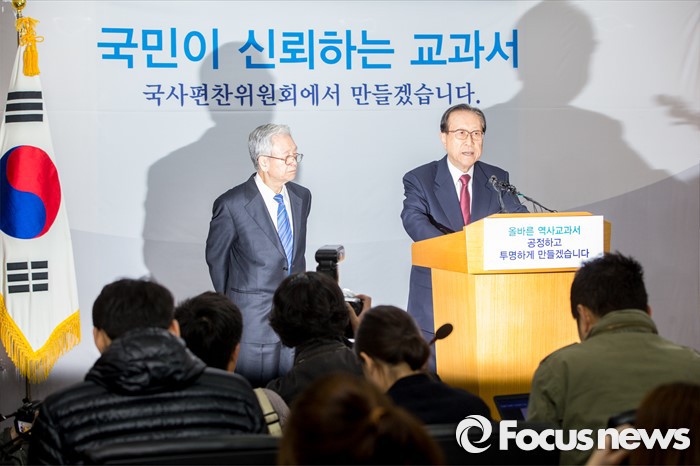 | △ 김정배 국사편찬위원회 위원장이 4일 오전 서울 종로구 세종대로 정부서울청사 브리핑룸에서 '올바른 역사교과서 개발' 관련 발표를 하고 있다. <사진제공=포커스뉴스> |