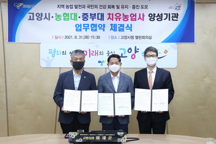 [부자동네타임즈 김인수기자] 고양시와 농협대학교(총장 최상목) 산학협력단, 중부대학교(총장 엄상현)가 지난달 31일 고양시청 열린회의실에서 치유농업사 전문인력 양성을 위한 상호 업무협약을 체결했다.