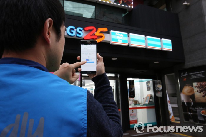 | △ 24일 원격 점포관리 시스템(SEMS)가 구축된 GS25 점포에서 경영주가 모바일을 사용해 원격으로 간판을 점등하고 있다. <사진제공=GS리테일> |