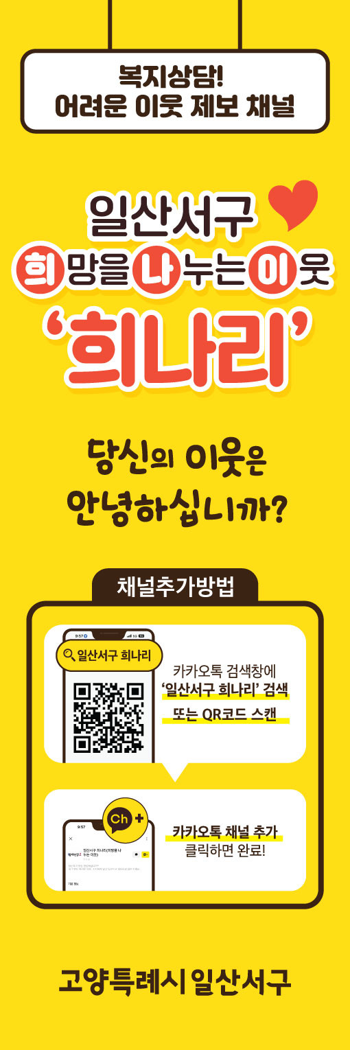 구 관계자는 “주민 누구나 카카오톡 검색 창에서 ‘일산서구 희나리’를 검색해 가입하면 각종 복지서비스에 대한 안내도 받고, 어려운 이웃을 제보할 수 있다.”며 “제보를 통해 발견된 가구에 대해서는 신속한 복지서비스를 적극적으로 제공할 계획이다.”라고 말했다.