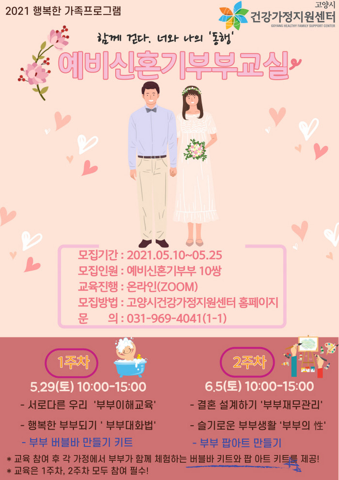 [부자동네타임즈 김인수기자] 고양시 건강가정지원센터에서는 예비·신혼기 부부들의 행복한 결혼생활을 위한 교육 ‘예비·신혼기 부부 교실’을 이달 29일, 내달 5일 실시한다.