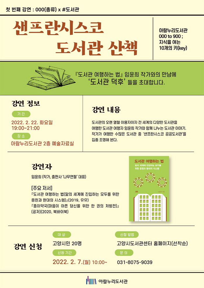 올해 첫 번째 강연은 한국십진분류표상 000번대 ‘총류’, 그중에서도 ‘도서관’을 다루는 샌프란시스코 도서관 산책이다. 강연자는 도서관 여행하는 법의 저자 임윤희 작가이다.