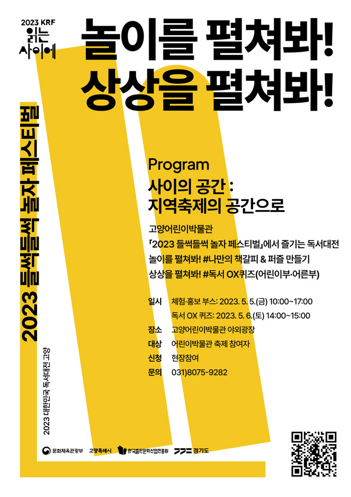[부자동네타임즈 김인수기자] 올해 고양어린이박물관에서 열리는 어린이날 축제에 대한민국 독서대전이 함께한다. 고양특례시(시장 이동환)는 ‘2023 대한민국 독서대전 고양’ 협력 프로그램을 어린이날 축제 ‘들썩들썩 놀자 페스티벌’에서 운영할 예정이다.