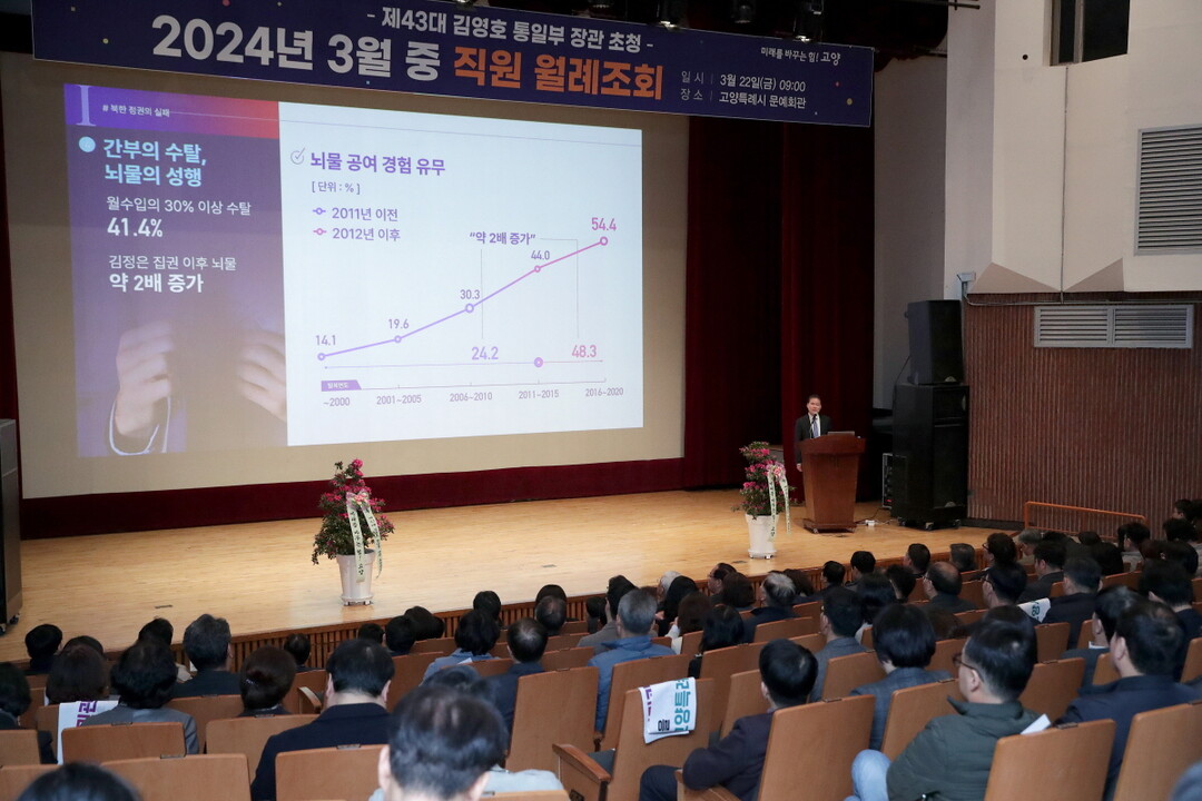 [부자동네타임즈 = 김인수 기자] 김영호 통일부 장관은 22일 고양특례시청 공직자를 대상으로 북한의 경제 사회 실태 및 우리의 대북정책 추진방향을 주제로 열정적인 강연을 펼쳤다.