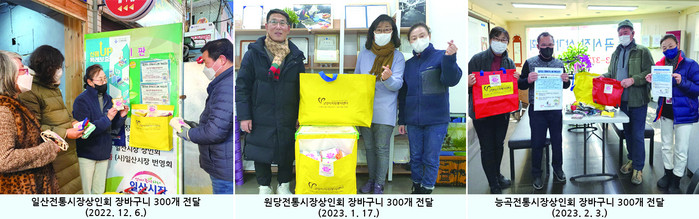 각 가정에서 모아온 장바구니는 자원봉사자들의 바느질 솜씨로 캠페인 라벨 부착 후 일산전통시장상인회에 300개, 원당전통시장상인회에 280개, 능곡전통시장상인회에 150개가 전달되어 시민들에게 배포 중이다.