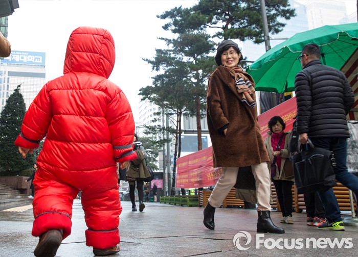 (서울=포커스뉴스) 2일 오후 서울 중구 남대문로에서 방한 우주복을 입은 어린이가 걸어가고 있다. 기상청은 오늘 밤부터 기온이 크게 떨어지기 시작해 내일 전국 대부분 지방에 눈이 내릴 것으로 전망했다.