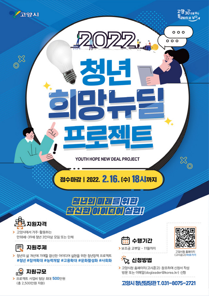 [부자동네타임즈 김인수기자] 고양시가 청년 희망뉴딜 프로젝트에 참여할 청년 단체(모임)에 대한 공개모집을 1월 17일부터 2월 16일까지 실시한다.