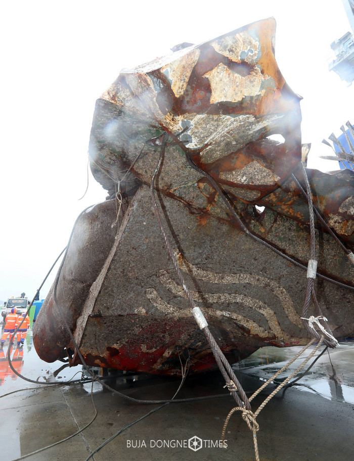 세월호 선체를 육상에 거치하는 작업이 초읽기에 들어간 5일 오전 전남 목포신항만에 사고해역에서 수거된 세월호의 굴뚝이 이송되고 있다. 2017.04.05.