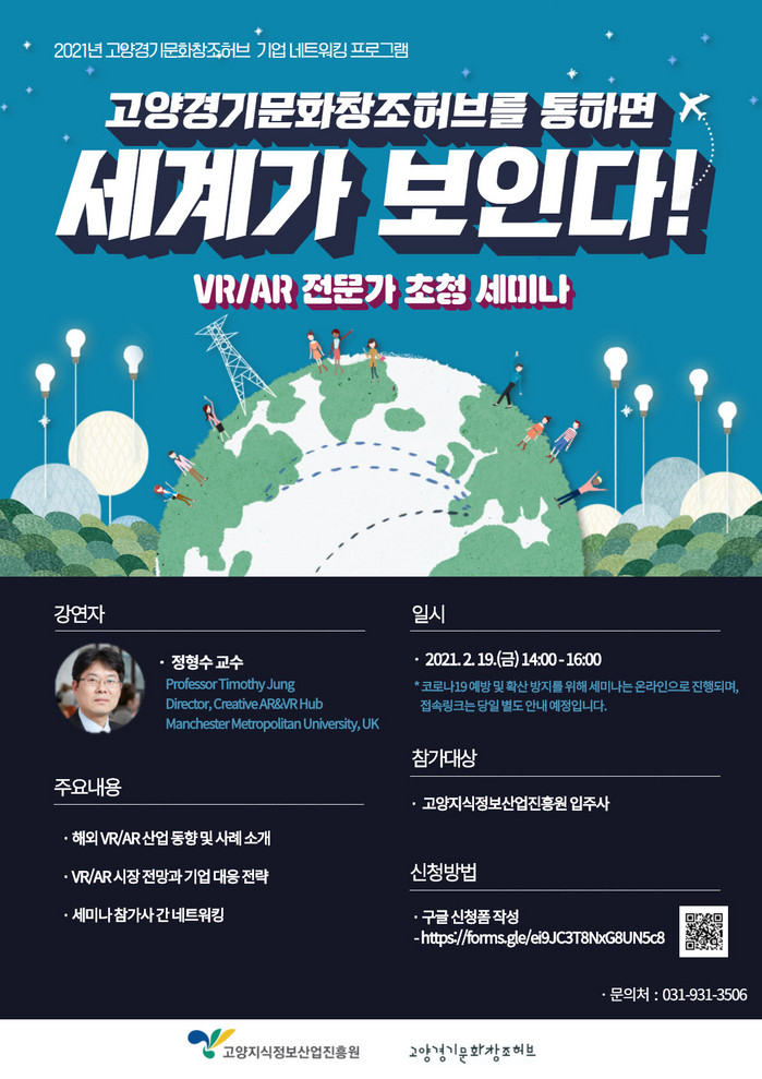 [부자동네타임즈 김인수기자] 고양시 산하 고양지식정보산업진흥원(원장 오창희, 이하 진흥원)이 운영하는 고양 경기문화창조허브에서 오는 19일(금) 2021년 1차 기업 네트워킹 프로그램으로 ‘VR‧AR 전문가 초청 세미나’를 개최한다.