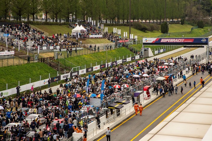 [사진설명] 에버랜드 스피드웨이에서 열린 2019시즌 CJ대한통운 슈퍼레이스 챔피언십 개막전 당시 그리드워크에 수많은 관람객이 모여 행사를 즐기고 있다.