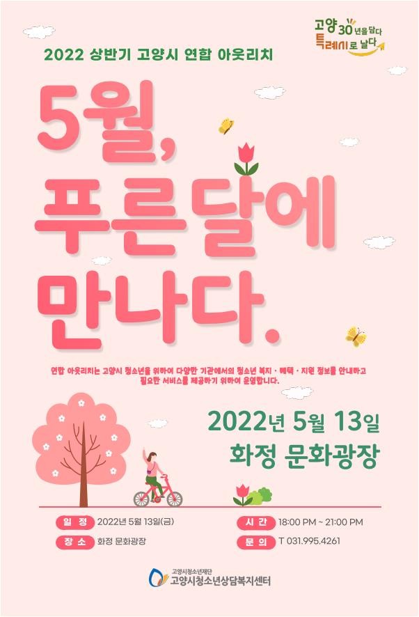 [부자동네타임즈 김인수기자] 재단법인 고양시청소년재단(대표이사 박윤희) 산하기관인 고양시청소년상담복지센터(센터장 황상하)에서는 오는 5월 13일 지역사회 청소년 유관기관과 함께 연합 아웃리치를 운영한다고 밝혔다.