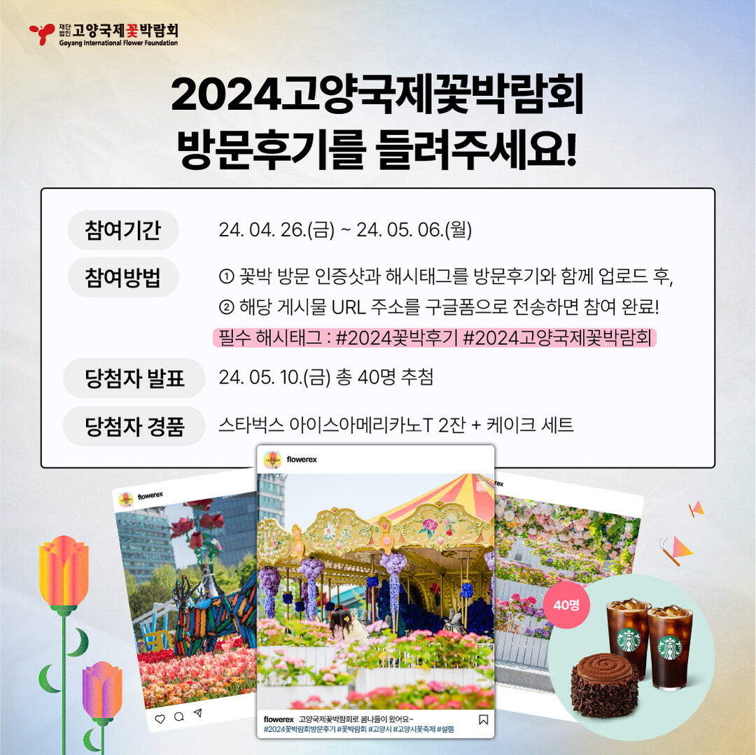 ‘2024고양국제꽃박람회 방문후기’이벤트는 2024고양국제꽃박람회에 방문한 인증사진과 본문에 해시태그(#2024고양국제꽃박람회 #2024꽃박후기)를 포함한 방문후기를 작성한 후, 재단법인 고양국제꽃박람회 소셜네트워크서비스(SNS)를 통해 공유하면 된다. 참여기간은 5월 6일까지다.