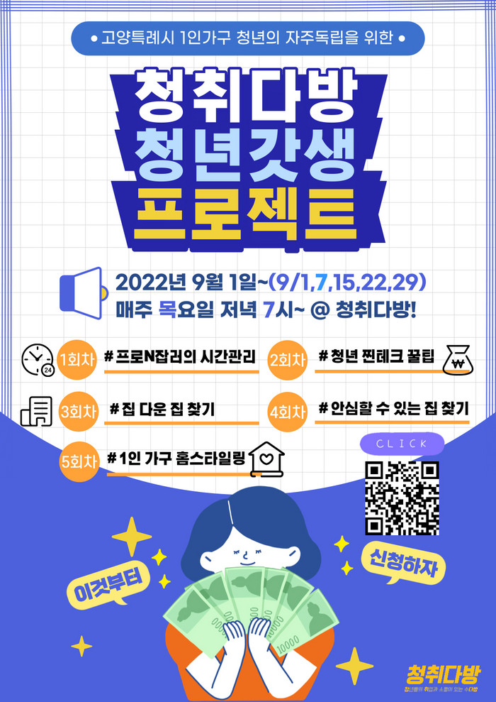교육은 오는 9월 1일부터 매주 목요일 저녁 7시부터 2시간 가량, 총 5회에 걸쳐 고양시 청년공간인 청취다방에서 진행된다. △프로 N잡러의 시간관리 △청년 찐테크 꿀팁 △집다운 집 찾기 △안심할 수 있는 집 찾기 △1인 가구 홈스타일링 내용 등을 다룬다.