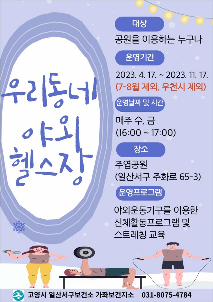[부자동네타임즈 김인수기자] 고양특례시(시장 이동환) 일산서구보건소는 17일부터 주엽공원과 탄현숯고개공원에서 공원기구 운동 프로그램 ‘우리동네 야외헬스장’을 운영한다.