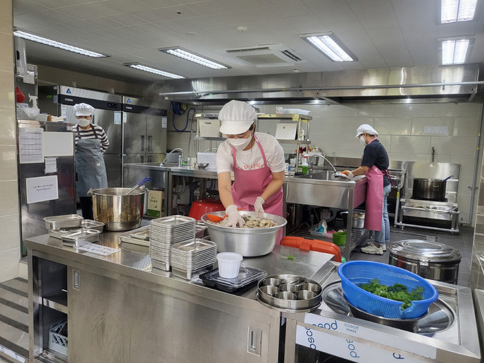 [사진설명] 청년 희망 일자리 참여자가 취약계층 어르신에게 배달할 식사를 준비하고 있다.