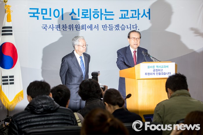 | △ 김정배 국사편찬위원회 위원장이 지난 4일 오전 서울 종로구 세종대로 정부서울청사 브리핑룸에서 '올바른 역사교과서 개발' 관련 발표를 하고 있다. <사진제공=포커스뉴스> |