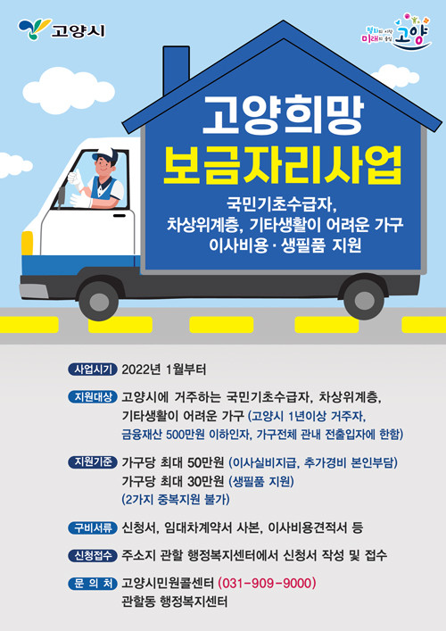 고양희망보금자리 사업은 고양시사회복지협의회(고양희망나눔운동본부)와 협업해 관내에 거주하는 국민기초수급자, 차상위계층, 기타생활이 어려운 가구의 이사비용 및 생필품을 지원해주는 사업이다.