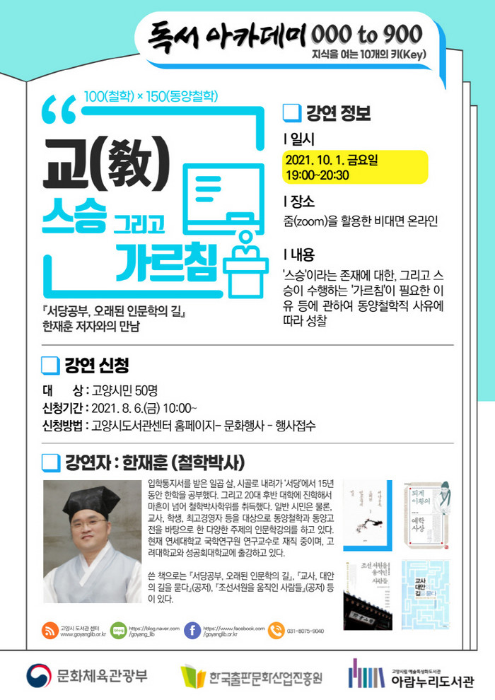 [부자동네타임즈 김인수기자] 고양시 아람누리도서관은 문화체육관광부가 주최하고 한국출판문화산업진흥원이 주관하는 2021년 독서아카데미 수행기관으로 선정돼 ‘지식을 여는 10가지 키(key)’의 시즌3을 진행하고 있다. 시즌 3의 두 번째 강연 10월 1일(금) 오후 7시에 진행된다.