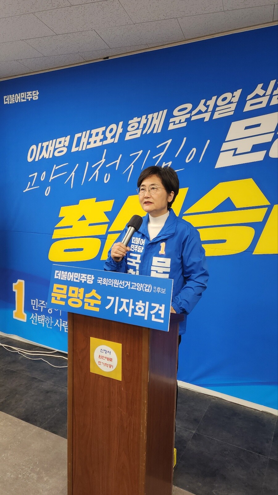 문 예비후보는 “지난 이재명 대표와 함께 검찰독재와 싸워왔다”며 “민주당이 선택한 후보, 이재명을 지켜온 후보 문명순이 고양갑 주민들의 염원을 모아 22대 총선 승리를 이끌고 고양갑을 관광, 산업, 교육 주거의 명품 도시로 키워내겠다”고 강조했다.