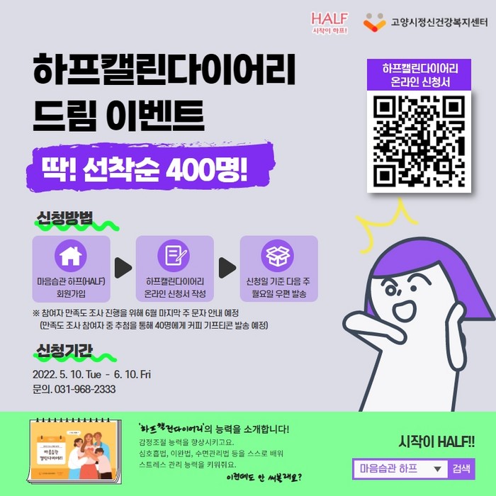 2차 이벤트는 5월 10일부터 6월 10일까지 한 달간 진행되며 마음습관 프로그램 하프(HALF)에 가입 후 온라인 신청서를 작성한 선착순 400명에게 하프캘린다이어리를 무료로 배포한다.