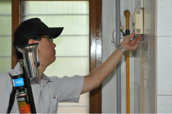 | △ 소방관이 건물내 소방시설을 점검하고 있다. |