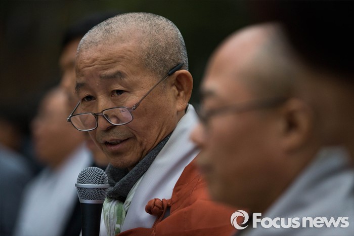 | △ 19일 오후 서울 종로구 조계사에서 조계종 화쟁위원회 위원장 도법 스님이 한상균 민주노총 위원장 신변보호 요청에 대한 화쟁위 회의 결과를 발표하고 있다. <사진제공=포커스뉴스> |