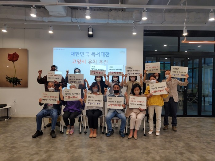 [사진설명] 고양시 도서관운영위원회가 2023 대한민국 독서대전 유치 기원 퍼포먼스를 하고 있다.