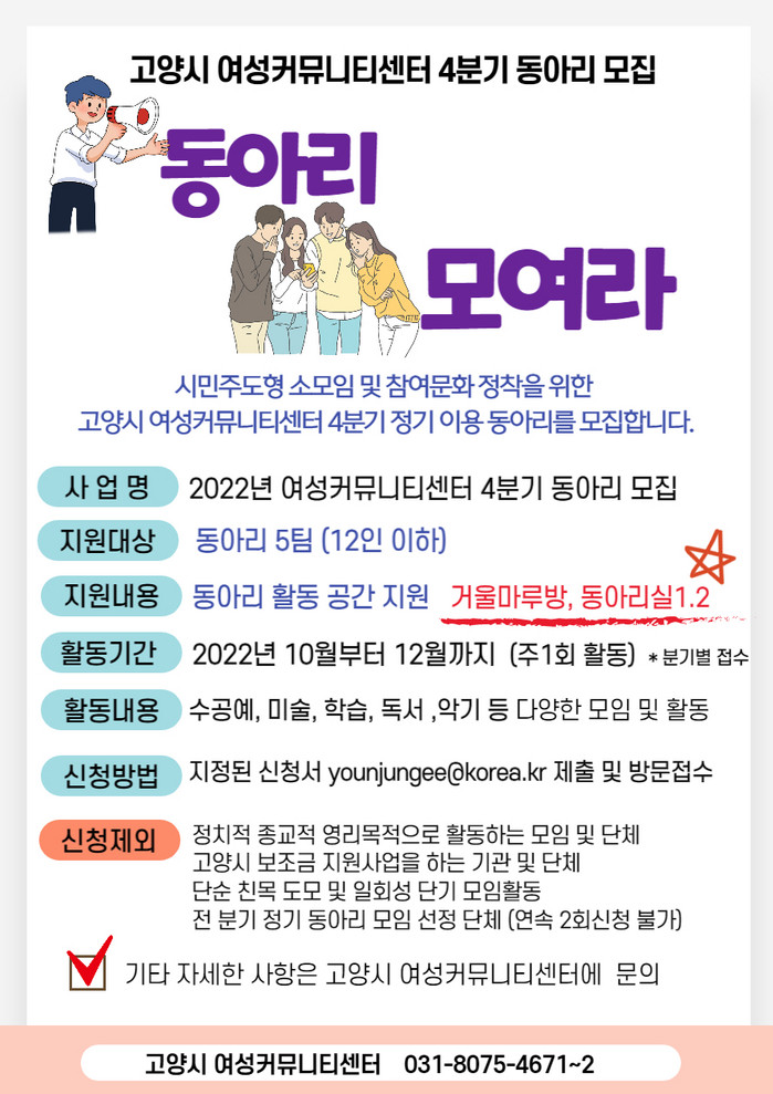 [부자동네타임즈 김인수기자] 고양특례시(시장 이동환) 여성커뮤니티센터가 시민주도형 소모임 및 참여문화정착을 위한 4분기 정기 이용 동아리를 모집한다.