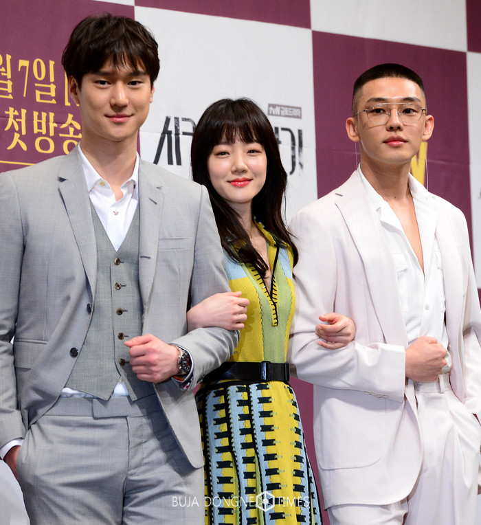 5일 오후 서울 강남구 임피리얼 팰리스에서 열린 tvN '시카고 타자기' 제작발표회에서 고경표(왼쪽부터), 임수정, 유아인이 포즈를 취하며 환하게 웃고 있다. 2017.04.05.