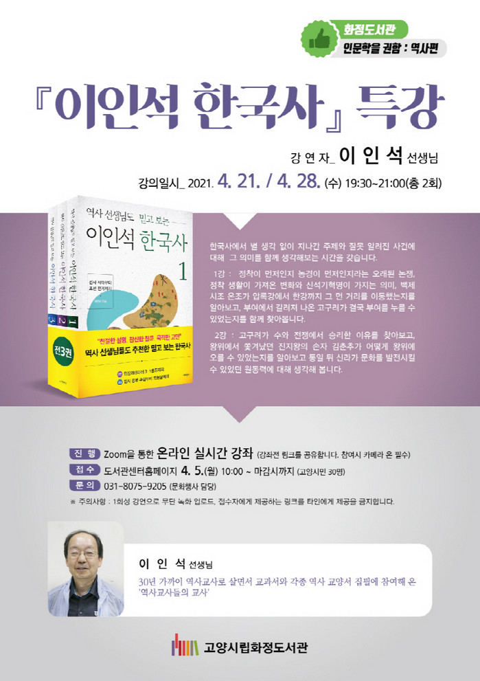 [부자동네타임즈 김인수기자] 고양시는 "화정도서관이 연중 테마 강좌 "인문학을 권함 : 역사편"으로 ‘이인석 한국사’를 선정, 특강을 진행한다."고 밝혔다. 강좌는 오는 4월 21일, 28일 이틀간 온라인 줌(ZOOM)을 활용해 온라인으로 진행한다.