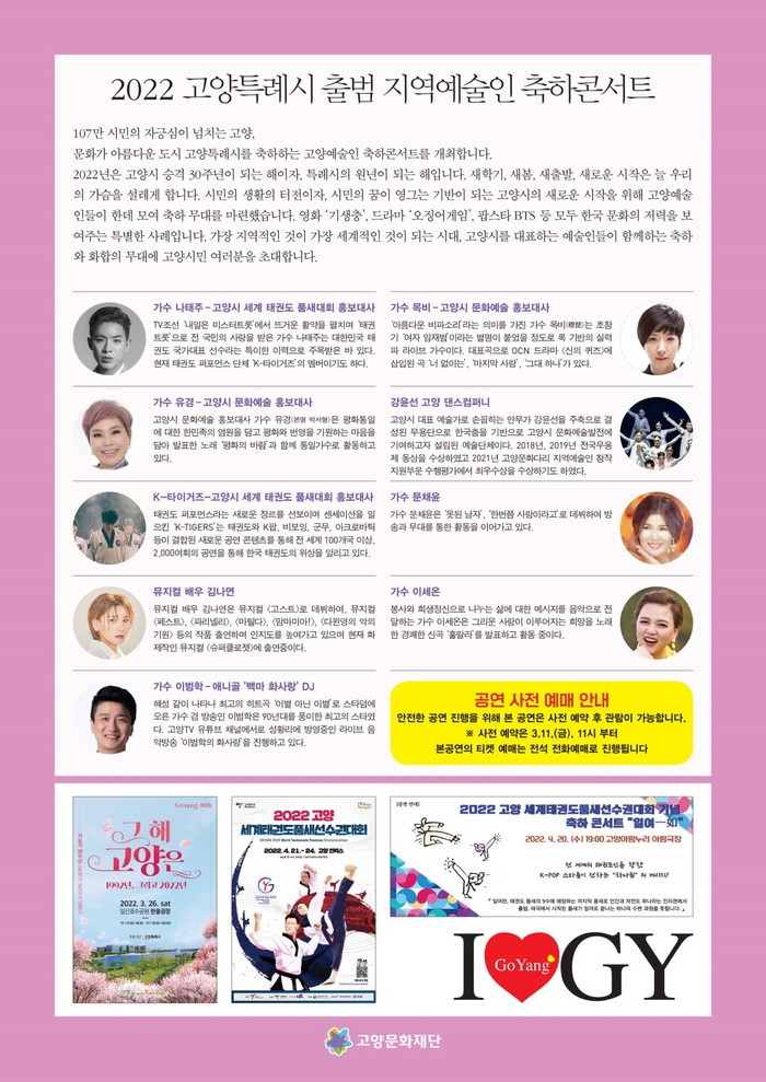 [부자동네타임즈 김인수기자] 고양문화재단(이사장 이재준)은 2022년 고양특례시 출범 원년과, 고양시 시승격 30주년을 기념하기 위하여 다양한 장르의 지역 예술인들이 한데 어우러지는 고양특례시 출범 지역예술인 축하콘서트를 개최한다. 콘서트 타이틀은 <아이 러브 고양 (I ♥ GY)>이며 오는 3월 23일(목)에 고양어울림누리어울림극장에서 고양시민들을 대상으로 무료로 진행될 예정이다.