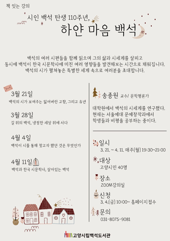 [부자동네타임즈 김인수기자] 고양시 백석도서관이 오는 3월 21일부터 4월 11일까지 총 4회에 걸쳐 고양시민을 대상으로 책 잇는 강의: 시인 백석 탄생 110주년, 하얀 마음 백석을 진행한다.