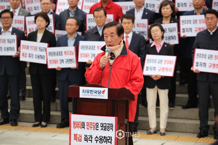 존경하는 국민여러분. 자유한국당은 많은 것 원하지 않는다. 정의롭고 공정한 대한민국을 외친 문재인 대통령이 지난 대선공간에서 드루킹 댓글조작과 아무런 상관이 없다는 것, 특검 수사결과가 밝혀지면 얼마나 더 정정당당한 대통령되겠는가. 남북정상회담 정성 들여서 잘하시면서, 왜 드루킹 특검은 이렇게 수용하지 않고 있는가. 이렇게 꼼수를 쓰고 있는지. 왜 그렇게 중요한 추경 왜 5월 하순에 처리하자는 것인가. 빨리 처리해야 된다.
