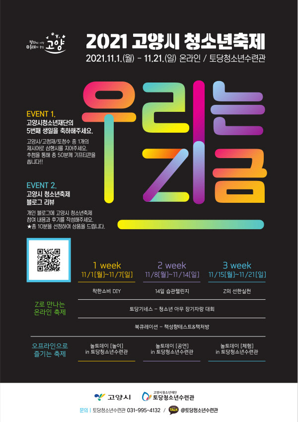[부자동네타임즈 김인수기자] 고양시청소년재단(이사장 이재준) 토당청소년수련관은 "오는 11월 1일부터 11월 21일까지 3주간 2021년 고양시 청소년축제 ‘우리는, Z금’을 개최한다."고 밝혔다.