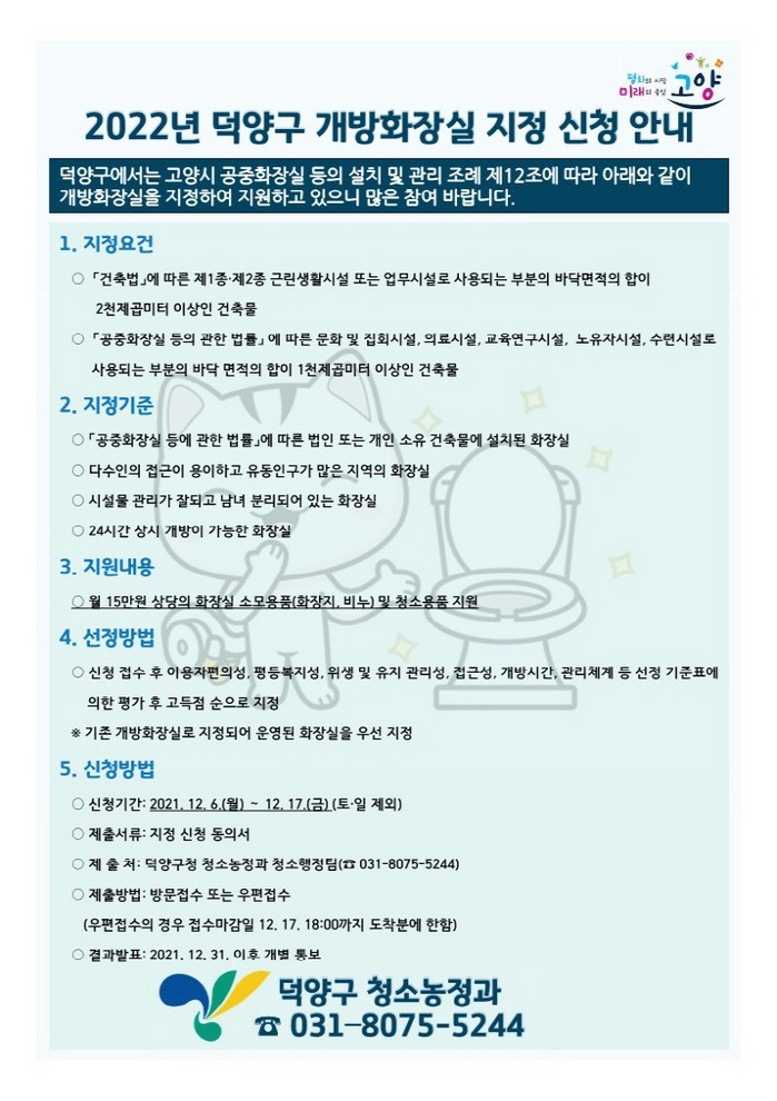 접수기간은 12월 6일부터 17일까지이며, 신청방법은 건물주 또는 관리인이 덕양구청 청소농정과에 지정 신청 동의서를 방문.우편 제출하면 된다.